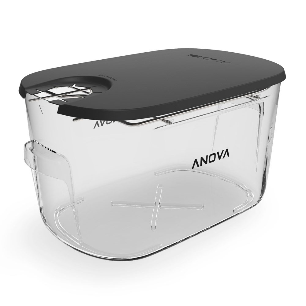 מיכל בישול סו-ויד של אנובה (ANOVA) בנפח של 12 ליטר. האח הקטן והחדש למיכל ה 16 ליטר הותיק שלהם. המיכל מותאם במיוחד לבישול בואקום בעזרת מכשירי הבישול של אנובה. עיצוב HemiFlow אשר מתבסס על דפנות מעוגלות בכדי למקסם את הסריקולציה של המים ולעזור למכשיר הבישול לעבוד בצורה יעילה הרבה יותר. מכסה המיכל עשוי מסיליקון אשר תורם לאטימה מלאה בזמן הבישול. המיכל כולל רשת מובנית אשר מונעת מהשקיות לצוף ומאפשר לסדר אותן בצורה מיטבית. בסיס מוגבה בגובה 3 מ”מ אומר שתוכלו להשתמש במיכל גם על השיש או משטחים אחרים ללא שום חשש מהתחממות גם אם אתם מתכננים בישול ארוך מאד.